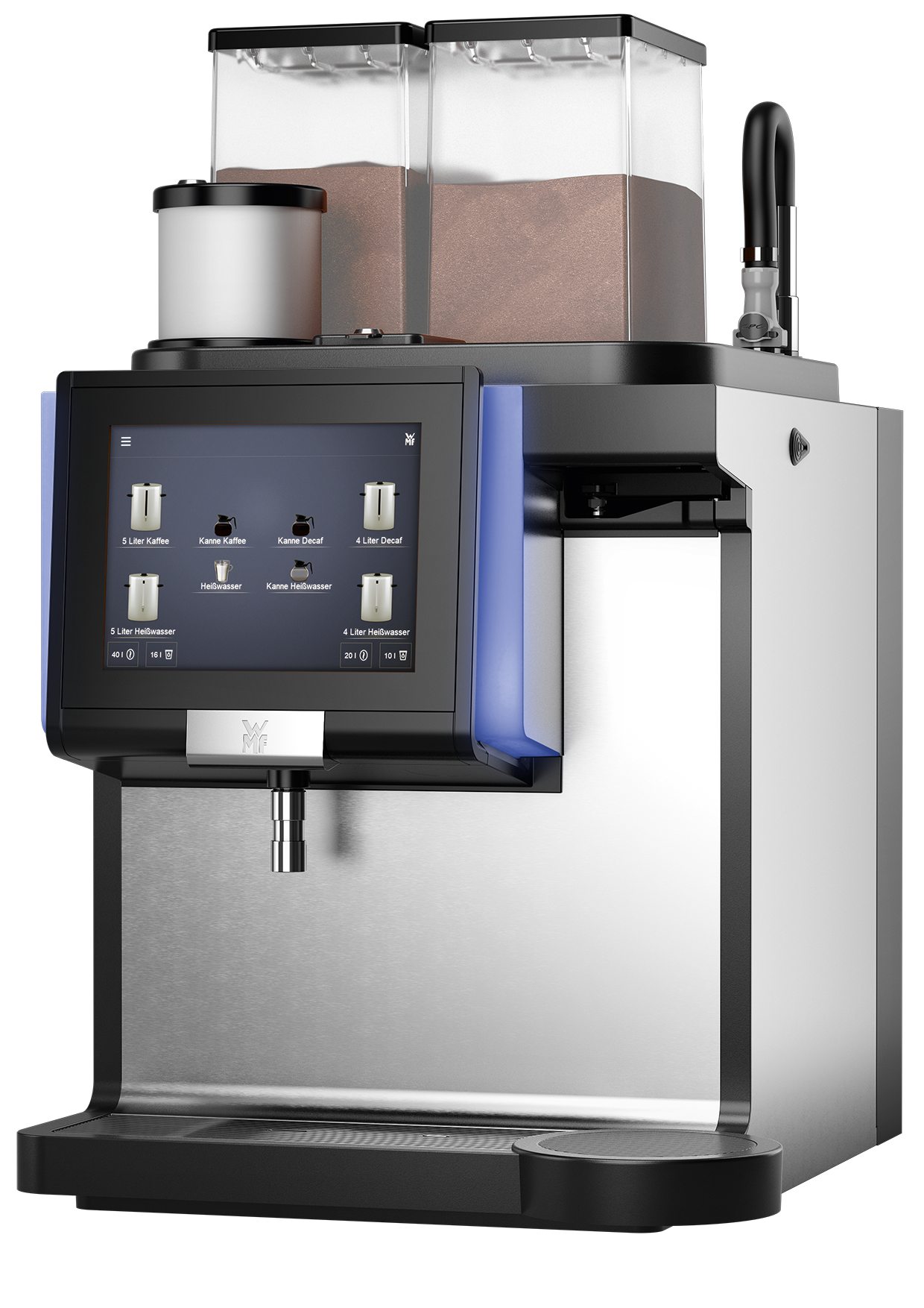 Der er mulighed to forskellige typer kaffe og valg af forskellige bryg mængder ved hjælp af en brygarm eller kandeudtag. Her lever den nye WMF 9000F fleksible muligheder på alle felter. Til dispensering af mindre mængder varmt vand finder kunden eller medarbejderen varmvandsudløbet direkte under det store 10-tommer Touch display.