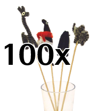 Små garnfigurer af forskellige dyr, på en tilspidset pind.