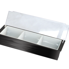 Til opbevaring af diverse pynt til cocktails, denne model har 3 rum. Er lavet i sort plastik.